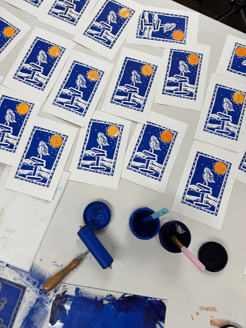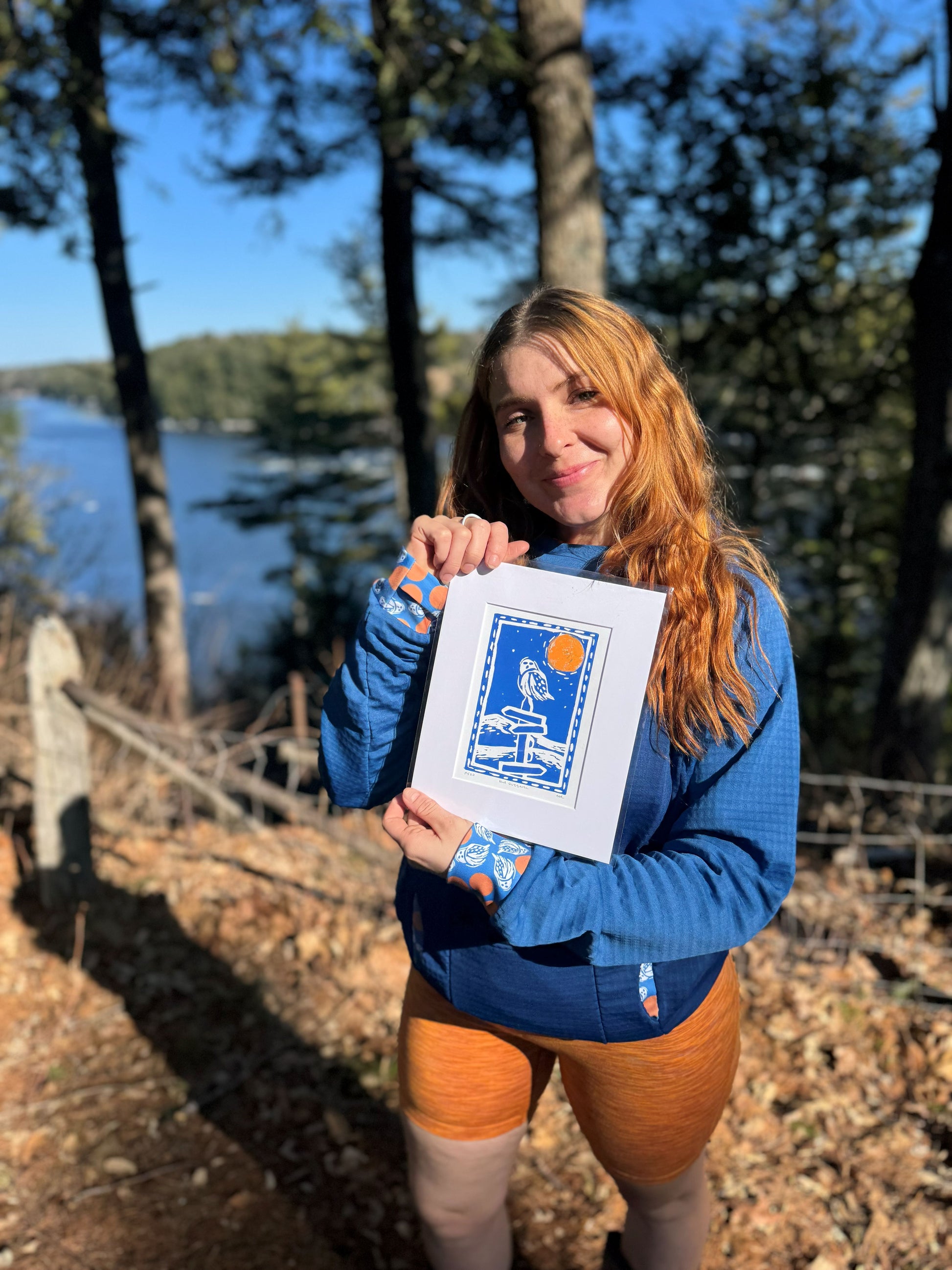 "This project came about from a linoleum block print I made over the winter of a snowy owl on top of Sargent Mountain in Mount Desert Island, ME. I love complimentary colors so I wanted the full moon to be big and orange against the blues of the landscape. Once I started designing, I loved how the owl and moon became abstracted and turned almost into a traditional pattern, especially when zoomed out. I hope this hoodie keeps you warm and reminds you of all the beauties that winter has to offer."